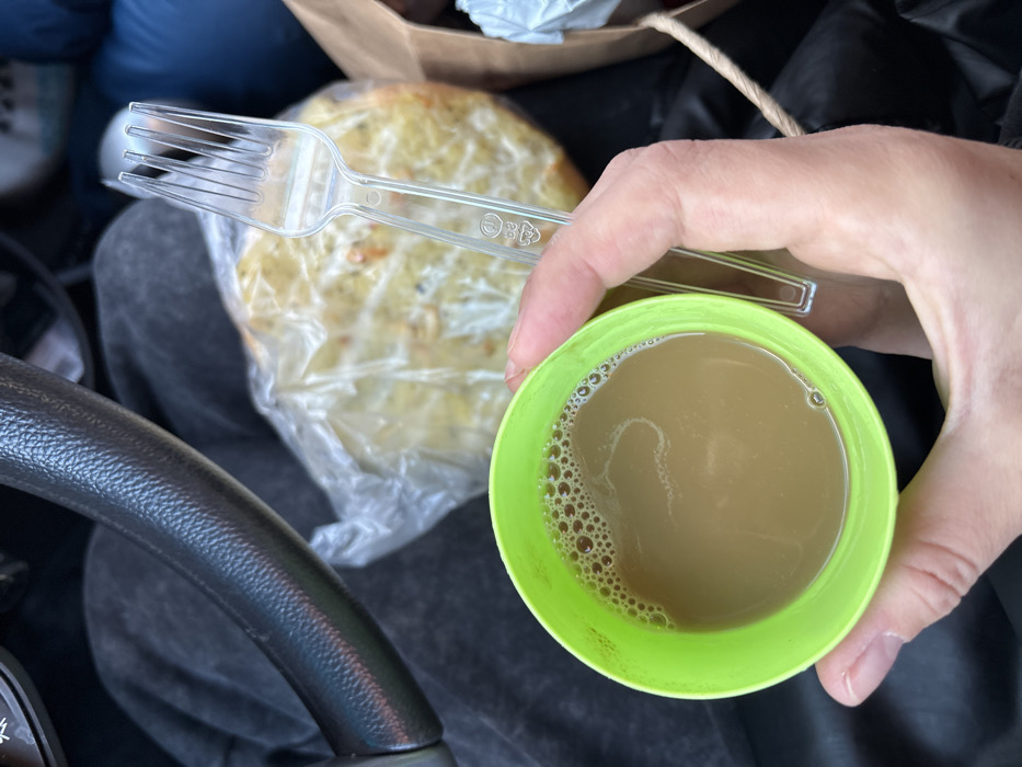 An individual holds a lime-green cup filled with a light-brown beverage, likely coffee with milk or creamer. A clear plastic fork rests on top of the cup and extends towards a wrapped flatbread or pizza, which sits on the person's lap. The setting appears to be inside a vehicle, as part of a steering wheel is visible in the foreground. The person's hand is partially in view, gripping the cup. A paper bag sits behind the flatbread. The individual is casually dressed in grey pants.