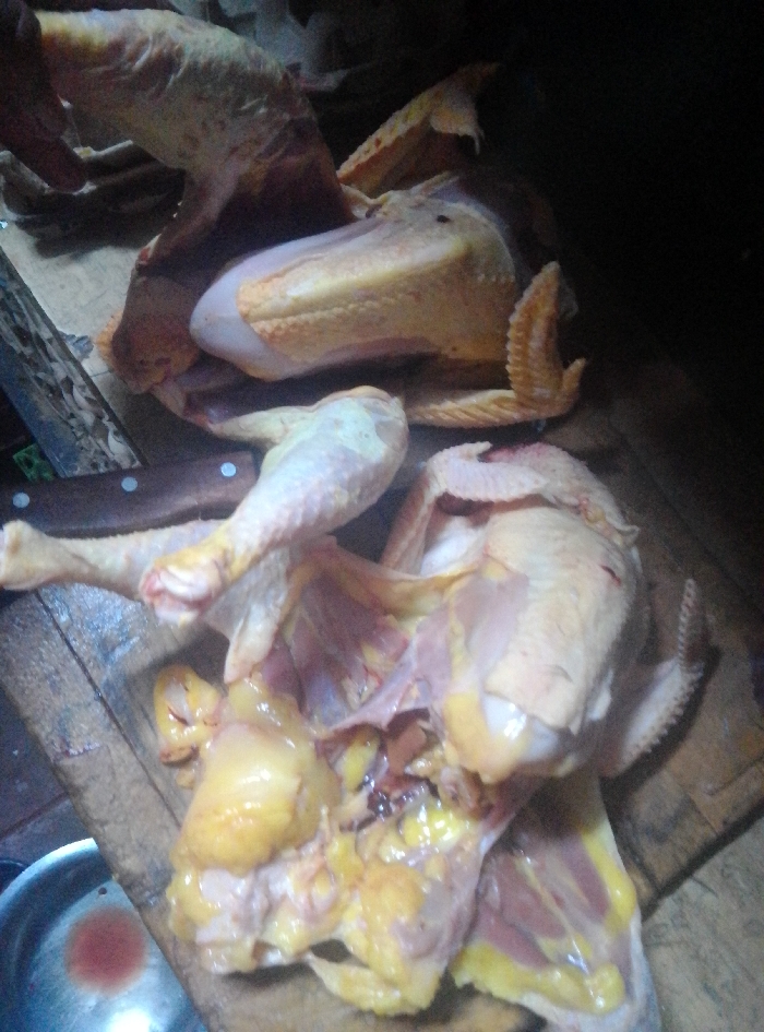 The image displays a close-up, overhead view of raw, processed poultry and associated tools on a wooden surface. Multiple chickens, varying in their state of dismemberment, are present. In the upper-center, a large, plucked chicken appears to be opened or prepared. Below it, a second chicken is extensively cut, with its chest cavity exposed, revealing internal yellow fat deposits and reddish muscle tissue. Individual chicken parts, including drumsticks and wings, are visible. A knife with a dark wooden handle and a metallic blade lies horizontally across the mid-left portion of the frame. A metallic bowl, containing a reddish liquid consistent with blood or stained water, is partially visible in the lower-left corner. The underlying surface is a worn wooden cutting board. The background is dark and indistinct. The specific location within Nairobi, Kenya, cannot be determined from the visual information in the image.
