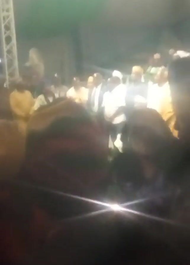 crowd of people gathered under a canopy, presumably for an event. Many individuals are wearing white, suggesting a formal or cultural occasion. There are large flags hanging from the scaffolding, and a banner with a person's face is visible in the background. A large fan is also noticeable, indicating warm conditions. The camera is shaky, giving a sense of being handheld and potentially moving through the crowd. The overall environment seems busy and lively.