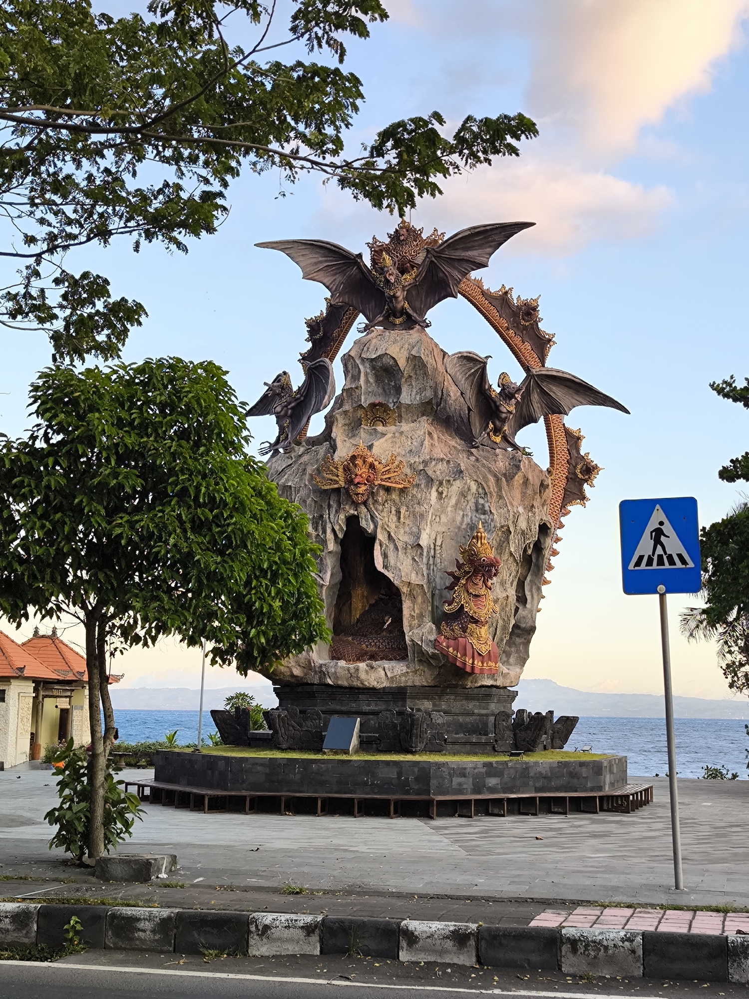 large, ornate dragon statue in the city of Pesinggahan, Indonesia. The statue features several winged dragons perched on a rocky structure with a central cave. The dragons are detailed with metallic accents and fierce expressions. Below the dragons, there are additional figures sculpted into the rock, painted in gold and red. The statue sits on a raised platform surrounded by low benches. In the foreground, a tree and a pedestrian crossing sign are visible. A glimpse of a building with a traditional Balinese roof is to the left. In the background, the ocean and distant mountains are seen under a partly cloudy sky. The foreground shows a paved area with a curb and a road. The overall scene suggests a public space or park.