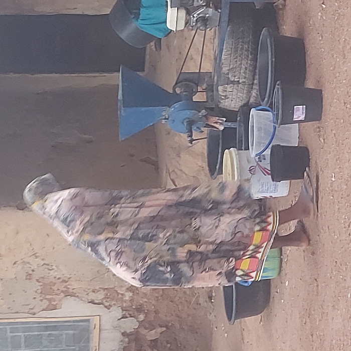 The scene depicts an outdoor area in the city of Unknown, Nigeria, against a backdrop of a weathered, light-brown building wall. A single individual, likely female, is present, positioned on the left side of the frame, facing right and slightly bent forward. She wears a full-length garment with a multicolored abstract pattern, predominantly light pink, grey, and black, and a distinct patterned border featuring yellow, red, black, and white at the hem. Dark flip-flops are visible on the bare dirt ground near her feet. In the center-right of the frame, a blue, funnel-topped grinding machine, likely a grain mill, is visible. A reddish cloth or material hangs from its output spout. This machine is mechanically linked via a belt to a small, light-colored internal combustion engine situated to its right. The engine and part of the grinding machine rest on a base constructed from two horizontally stacked vehicle tires. The ground around the machinery and the individual is covered in dry, reddish-brown dirt. Numerous containers are scattered: multiple black plastic basins of varying sizes, one white plastic bucket with a blue handle, one cream-colored plastic bucket, one clear plastic bucket with a blue handle, and a light green plastic basin. In the background, to the left, a window with horizontal bars is set into the building wall. To the far right, a dark rectangular opening, possibly a doorway, is visible, with a large black tub nearby. The overall environment appears to be a functional work area.