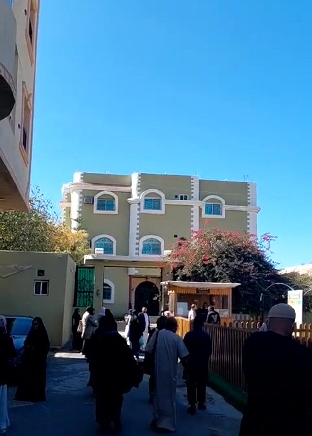 A group of people dressed in various attires are walking towards a green, two-story building. The building has arched windows, white trim and a few visible trees and plants. A small wooden structure is to the right of the entrance. The sky is clear and blue. There are buildings on either side of the street, and a parked car is visible on the left.