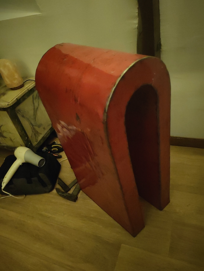 - "A large, red, U-shaped object dominates the scene, standing upright on a wooden floor" by FM-mYi593, licensed under CC BY 4.0