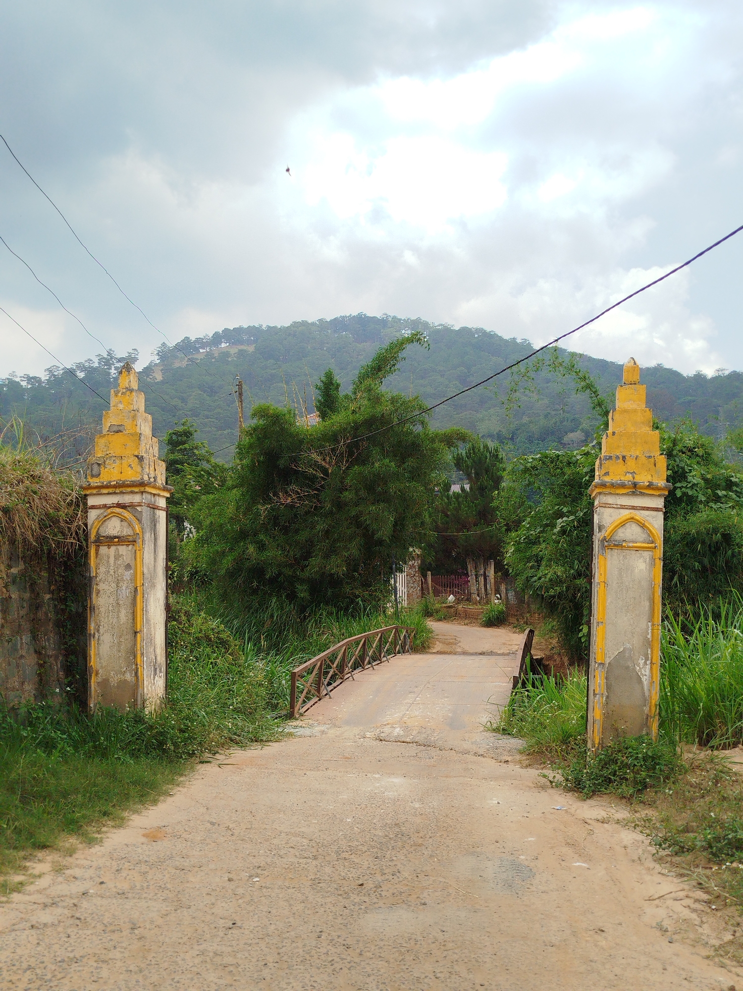 A medium-angle shot shows a narrow bridge flanked by two stone pillars in Hiệp Thạnh, Vietnam. The bridge, built with brown wooden railings and a concrete path, is situated on a dirt road. Lush green vegetation surrounds the bridge and pillars, which are painted yellow. In the background, a tree-covered mountain rises against a cloudy sky. Overhead electrical wires stretch across the scene.