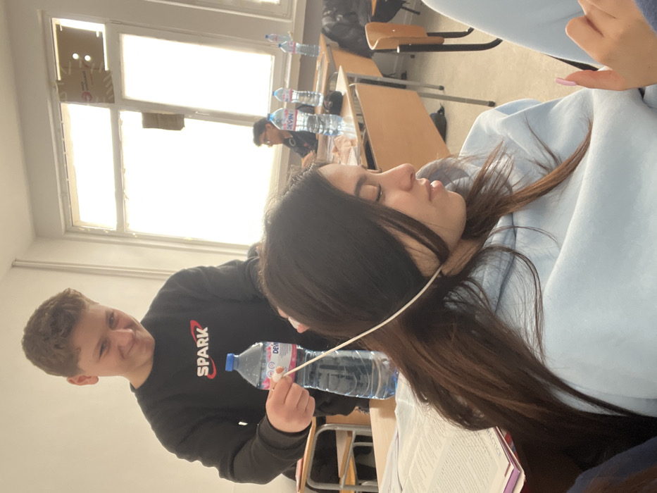 The image captures an indoor scene within a classroom in Veliko Tarnovo, Bulgaria, during daylight hours. In the foreground, a young male with short brown hair, wearing a black "SPARK" sweatshirt, stands over a seated young female with long dark hair, who is wearing a light blue hooded sweatshirt. The male holds a clear plastic "DEVIN" branded water bottle in his left hand. His right hand is positioned near the female's right ear, where he is inserting or holding a thin white stick-like object with a small white tip, from which a white wire extends and drapes over her ear. The male subject exhibits a slight smile, directed downwards at the female. The female's head is tilted slightly, her eyes are downcast, and her expression is neutral. An open textbook or notebook is visible on the desk in front of her. To the right, in the background, another male student is seated at a desk, where several "DEVIN" water bottles are also present. The classroom features white walls and large windows, one of which has a piece of cardboard taped to its upper pane. The windows emit bright, undifferentiated light, indicating an outdoor source.