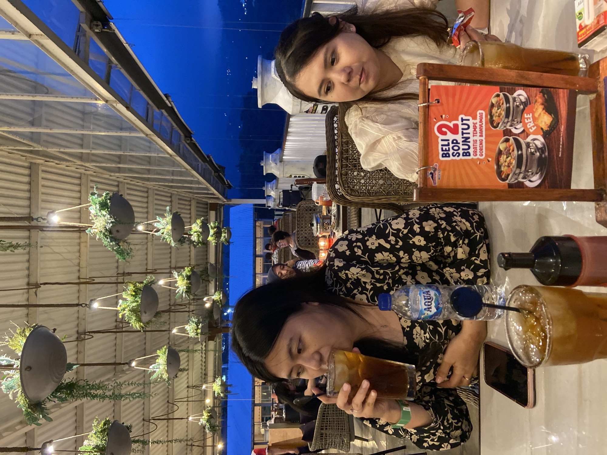 Two women sit at a table in an outdoor dining area in Prigen, Indonesia. The woman in the foreground wears a black and white floral print dress and drinks from a glass of iced tea. An Aqua water bottle, a smartphone, and a condiment bottle are also on the table. The woman in the background wears a white blouse. A menu board advertising "Beli 2 Sop Buntut Gratis Tempe Goreng Banyumas" (Buy 2 Oxtail Soups Get Free Fried Tempeh Banyumas) is visible on the table. Hanging planters with lights decorate the ceiling. Other diners are visible in the background. The sky is a deep blue, suggesting it is evening. The structure of the building and the roof are visible.