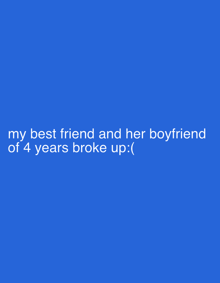 A digital image displays the text "my best friend and her boyfriend of 4 years broke up:(" against a solid blue background