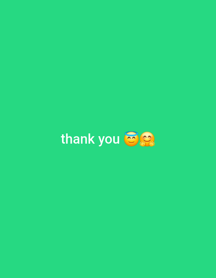 words "thank you" followed by two emojis. The first emoji is a smiling face with a halo, and the second emoji is a smiling face with hands hugging. The background is a solid green color.