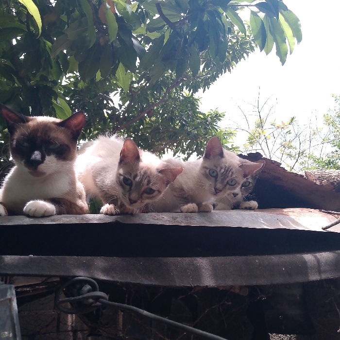 The image displays three felines positioned on a dark, weathered horizontal surface, captured in Juan Griego, Venezuela. The leftmost feline is an adult cat, exhibiting a cream-colored body with distinct seal point markings, including a dark brown facial mask, ears, and paws. Its front paws are tucked, and its gaze is directed forward, with eyes appearing partially closed. To its right are two smaller, likely juvenile felines, both presenting lighter cream or tan fur with subtle tabby-like markings on their faces and limbs, characteristic of a lynx point coloration. The middle juvenile is crouched low, observing a point slightly below and to its left, while the rightmost juvenile, also crouched, looks directly forward. Both juveniles have open, light blue-green eyes. The cats are situated on what appears to be a dark, corrugated, possibly metallic or aged material, potentially a roof edge or a structural beam. Above and behind the felines, the upper left quadrant of the background is occupied by dense green foliage from tree branches, casting diffused shadows. The upper right quadrant reveals a bright, predominantly white sky, indicative of daylight conditions, with sparser, dark tree branches visible against it. A piece of dark, possibly decayed wood or a branch segment rests on the right edge of the horizontal surface, behind the rightmost juvenile. The foreground below the felines is dark and indistinct, showing elements that could be part of an underlying structure or further foliage. The overall scene is outdoors, under bright illumination, depicting the felines in a state of rest or observation.