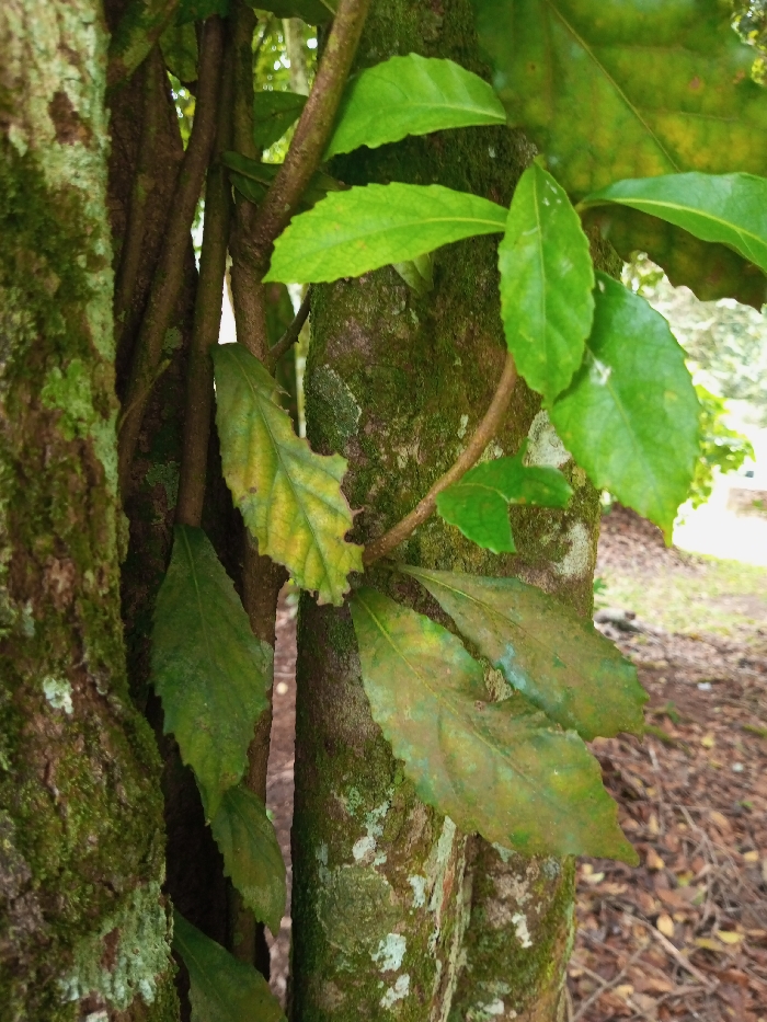 The image depicts a close-up view of multiple tree trunks within New Serchhip, India. The trunks, primarily brown, are extensively covered in patches of green moss and white lichen. A plant with brown stems and serrated-edge leaves is observed growing around and between the trunks. The leaves display varying hues: some are vibrant green, while others exhibit discoloration, appearing mottled yellowish-green and brownish-green, suggesting a range of conditions or age. The background is out of focus, showing blurred green foliage and brown ground cover. No human subjects or distinct objects beyond natural vegetation are present.