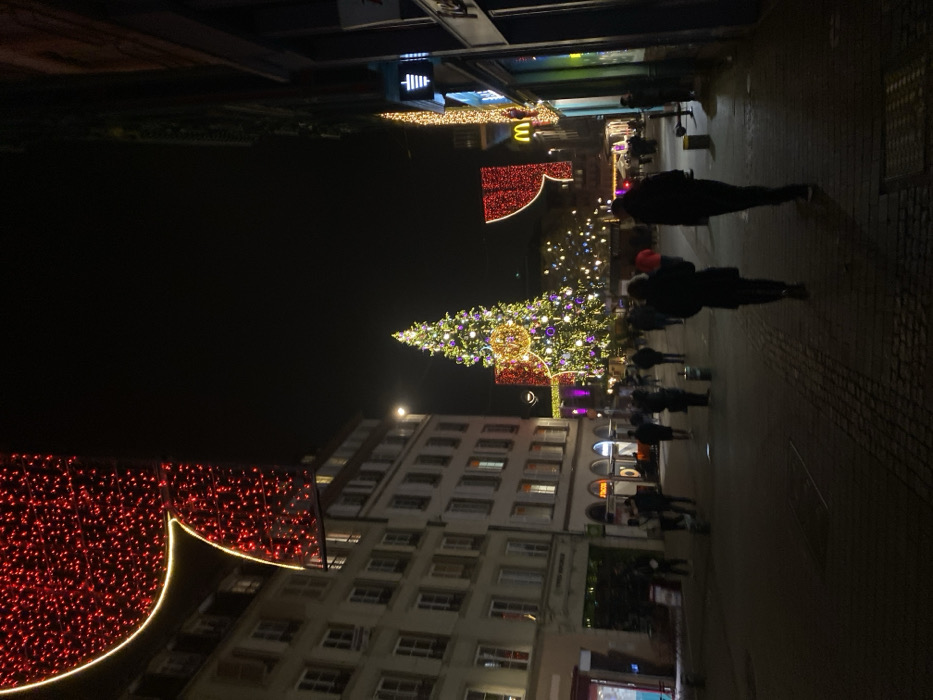 A nighttime cityscape reveals a pedestrian walkway adorned with Christmas lights and decorations. A large Christmas tree is illuminated with purple and gold ornaments, standing prominently in front of a multi-story building. Arched light displays in red dot the buildings and walkway. Silhouettes of people stroll along the brick-paved walkway. A McDonald's sign is also visible in the distance. The scene conveys a festive atmosphere with the glow of holiday lights.