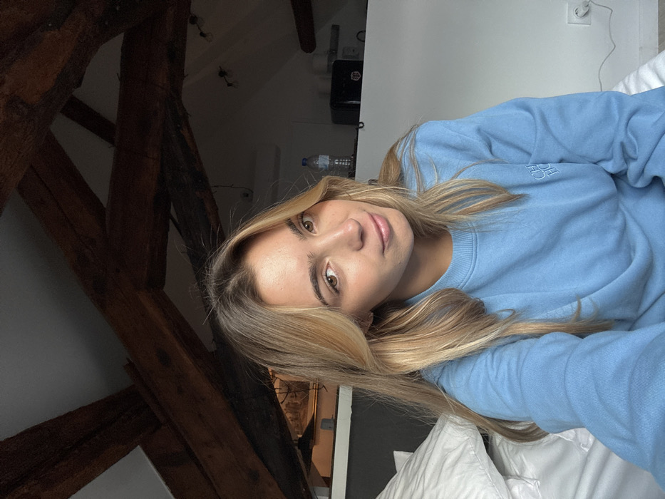 A young female, with long blonde hair and light highlights, brown eyes, and a slight smile, is depicted in a close-up, chest-up shot. She wears a light blue crew-neck sweatshirt with light blue embroidery on the left chest, partially obscured. She is seated or reclined on a white surface, with a white, striped pillow visible on the left. The background reveals an interior space, likely an attic or loft room, characterized by prominent dark, rough-hewn wooden ceiling beams. The ceiling slopes upward and is dark gray or black. On the left side of the background, a portion of a dark, reflective object is visible above a lower white partition. On the right, a transparent plastic water bottle with a blue cap rests on a white horizontal surface. Behind it, a dark electronic device is visible, with a small white object on its top. Further right and higher, two bare light bulbs are mounted on the sloped ceiling. A white electrical outlet with a white plug is visible on the lower right wall. The specific location in Villeurbanne, France, cannot be determined from the visual information provided in the image.