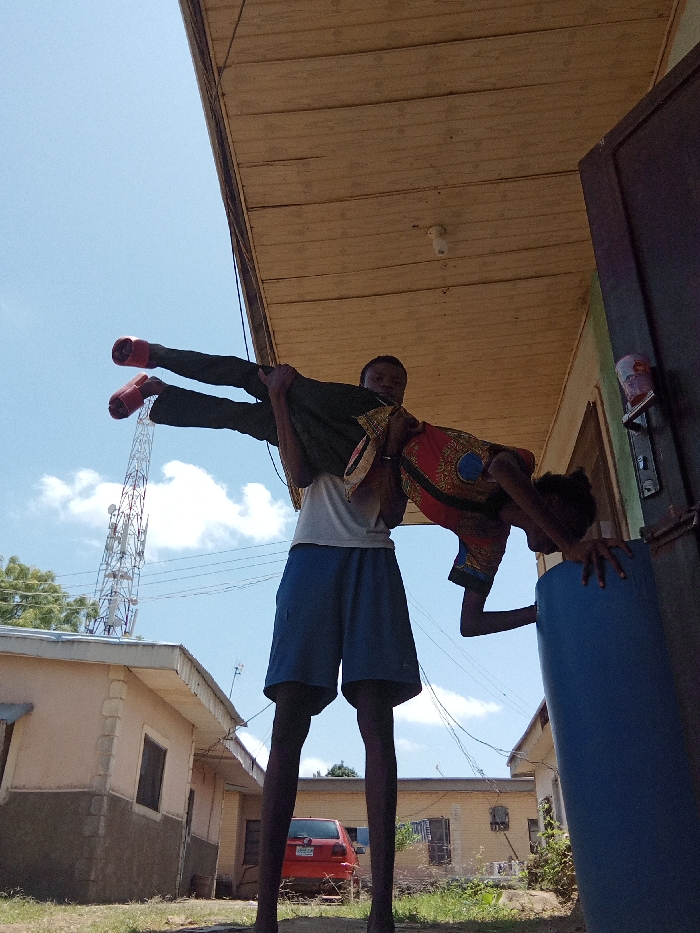 This image captures an outdoor scene in Narayi, Nigeria, under a bright, partly cloudy daytime sky. The perspective is low-angle, looking upwards at the subjects and overhead structures. Two male individuals are depicted. A taller male, wearing a light grey short-sleeved t-shirt and dark blue shorts, stands centrally, barefoot. He is supporting a smaller, younger male, who is positioned upside down. The smaller individual wears dark long pants, red slip-on sandals, and a short-sleeved shirt with a prominent red, yellow, and blue geometric pattern. The taller male holds the smaller male horizontally across his upper body, with the smaller male's legs extending upwards towards the left and his head inverted downwards towards the right. The smaller male's hands are placed on the rim of a dark blue, upright cylindrical container or barrel, which is positioned to the right of the frame. Above the subjects, a light-colored wooden soffit or ceiling of an architectural overhang is visible, from which a white light bulb fixture hangs. To the right, a dark brown doorframe and a partially open door are visible, with a red and white can attached to the doorframe. The background reveals a residential area with several single-story buildings constructed of light-colored materials. A red sedan is parked in the mid-ground between these structures. Further in the distance, a tall, metallic lattice communications tower stands against the sky. Overhead utility lines are visible traversing the scene. The ground in the foreground consists of dry grass and dirt.