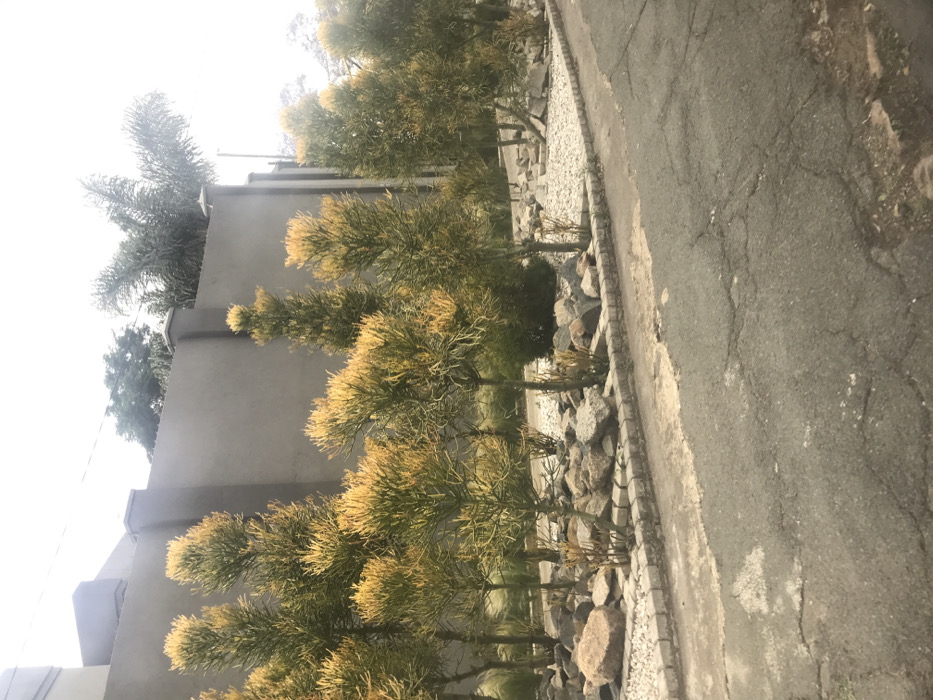 This image depicts a residential street scene in Johannesburg, South Africa. The foreground features a dark grey asphalt road exhibiting multiple cracks and signs of wear. Adjacent to the road, a light grey concrete curb with a segmented, brick-like pattern defines the edge of a landscaped area. This area is heavily decorated with various sizes of irregular grey rocks and scattered white pebbles. Multiple *Euphorbia tirucalli* (pencil cactus) plants with distinctive yellowish-green, mostly leafless, upright branches are prominent throughout the landscaped section, interspersed with smaller, drier-looking plant specimens. In the background, a tall, unadorned grey concrete perimeter wall with darker grey pillar caps rises, signifying a property boundary. Above and behind this wall, a dense arrangement of green tree foliage, including a prominent palm tree frond, is visible against a bright, overcast sky. Faint utility lines cross the upper portion of the sky. No individuals, vehicles, or dynamic actions are present within the frame.