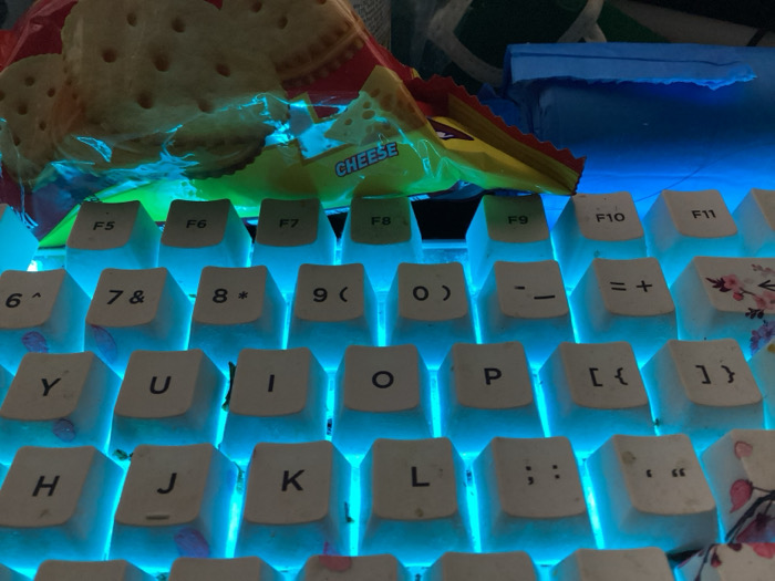 section of a mechanical keyboard with blue backlighting, with a partly-eaten bag of cheese crackers resting on the top row of keys. The keyboard has white keycaps and blue backlighting. The image is taken from a perspective directly above the keyboard. The keys visible in the image are F5, F6, F7, F8, F9, F10, F11, 6, 7, 8, 9, 0, -, =, Y, U, I, O, P, [, ], H, J, K, L, ;, and '. The image was taken in Vũng Tàu, Vietnam at the coordinates 10.366, 107.1.