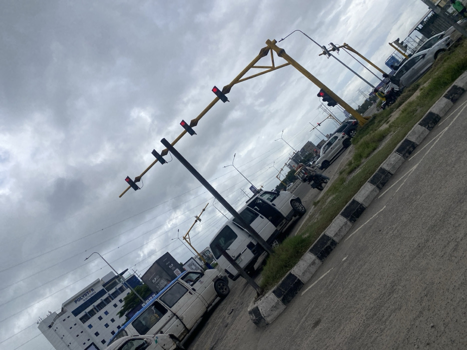 This image depicts a street scene in Ikate, Nigeria, under an overcast sky. The foreground features an asphalt road with a black and white painted curb separating it from a narrow, grassy median strip. Multiple white vans and cars are observed in various states of traffic. On the left, a white van with a light blue stripe is partially visible. Further right, another white van has its passenger-side door open. A motorcycle with a delivery box is positioned behind this open-doored van, and another motorcycle is visible further down the road next to a white sedan. Traffic lights, illuminated red, are mounted on yellow gantry-style poles, indicating a stop signal for vehicular traffic. Overhead, numerous power lines or utility wires crisscross the frame. In the background, a multi-story white building with blue accents and a "POLYSTAR" sign is visible on the far left, alongside other distant structures and billboards. The sky is predominantly grey with heavy cloud cover. No specific individuals are clearly discernible, but the presence of vehicles implies drivers and riders.