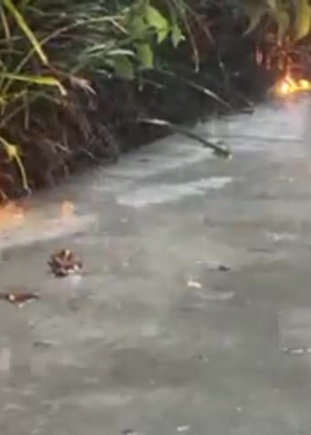 The video depicts a rainy scene on a sidewalk next to a patch of grass and foliage