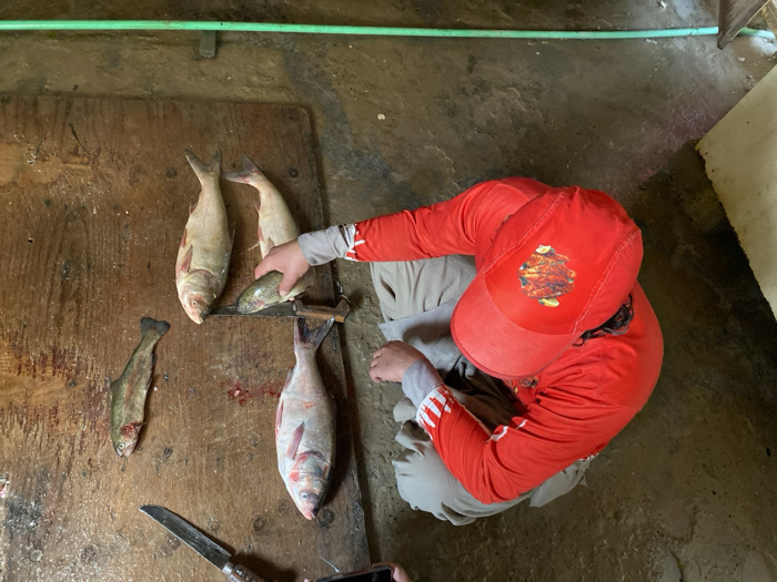 An overhead view in Deh Sabzi, Afghanistan, depicts a scene of fish processing. A single individual, viewed from above, is crouched on a dark, damp floor in the lower right quadrant. The person wears a long-sleeved red shirt and a red baseball cap featuring a stylized animal head emblem. Light-colored trousers are also visible. The central focus is a large, dark wooden surface, possibly a cutting board or table, which appears wet and stained with blood. Five fish are present on this surface. Three larger, light-colored fish (consistent with carp) are arranged: two horizontally at the top center, and one vertically in the lower right. Two smaller, darker fish (consistent with trout) are also present: one horizontally to the left of the upper two large fish, exhibiting blood near its head, and a fifth fish being held by the individual's right hand over the wooden surface. Two knives are visible on the wooden surface: one positioned horizontally in the lower left, its handle pointing left, and another, smaller knife embedded into the wood near the center, positioned vertically, around which the individual's hand is working. Blood spatter is visible on the wooden surface, particularly near the knives and fish. The surrounding environment consists of a dark, possibly concrete or dirt floor, and a green hose runs horizontally across the upper perimeter of the image. A light-colored wall or object is partially visible in the far upper right corner.