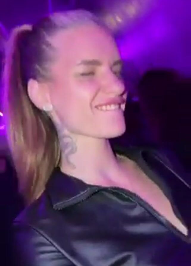 woman smiling and dancing in a club. She has blond hair pulled back in a ponytail, a snake tattoo on her neck, and is wearing a black jacket. The club is dark with purple and pink lighting, and there are screens with “THE HARDSTYLE” written on them.