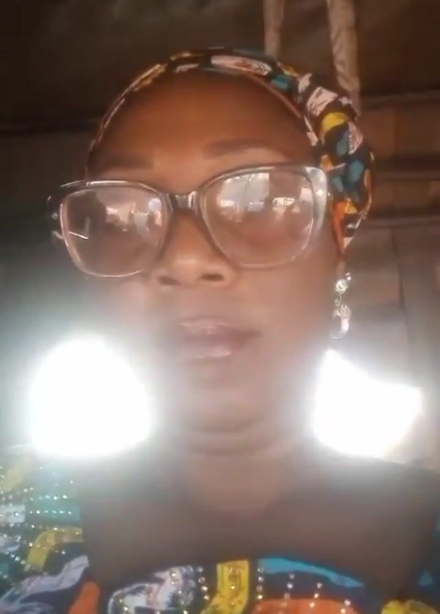 A woman with dark skin, wearing large, rectangular glasses with amber-tinted lenses, is centered in the frame. She also has a colorful headwrap and dangling earrings. Her top is patterned with blue, orange, white, and green designs and has shiny embellishments. The background appears to be an indoor space, possibly a covered area with wood paneling and dangling materials overhead. The lighting is somewhat harsh, with bright spots obscuring details.