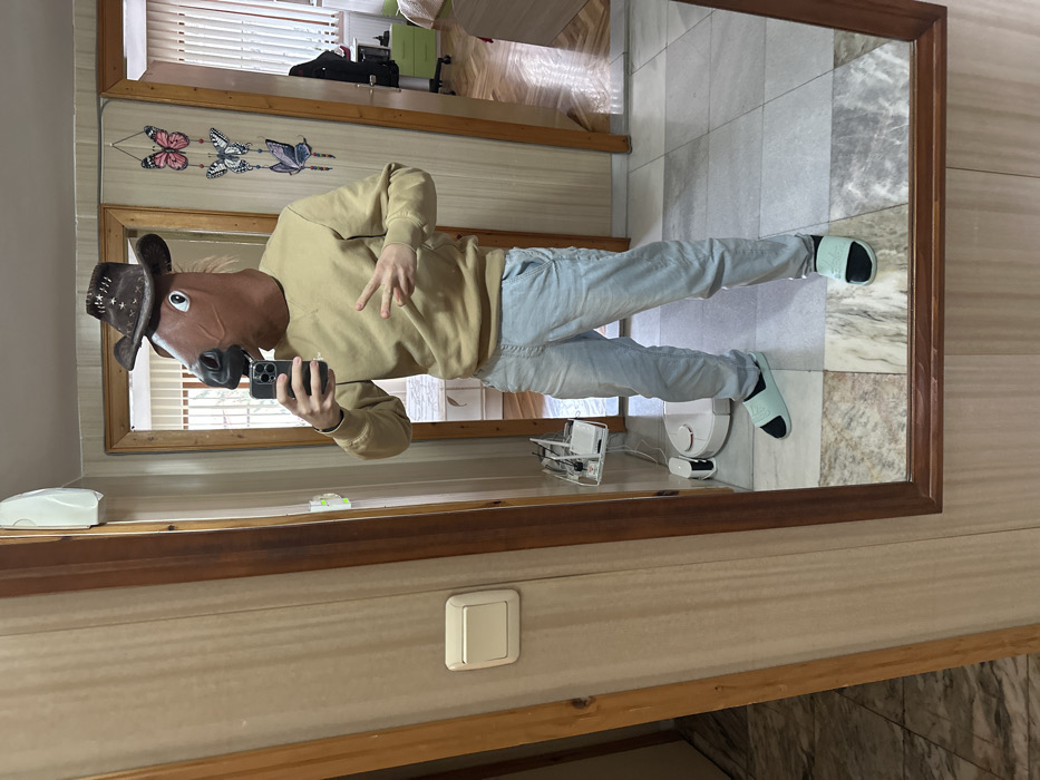 One individual is captured in a full-body mirror selfie within a domestic indoor setting in Razgrad, Bulgaria. The person is obscured by a brown horse head mask topped with a dark brown cowboy hat featuring white star accents. They are dressed in a plain beige long-sleeved crew-neck sweatshirt, light blue denim jeans, black socks, and light blue slides. The individual holds a dark-colored smartphone in their left hand, angled to capture the reflection, while their right hand is raised, forming a V-sign. The mirror has a dark brown wooden frame. To the left of the mirror, a wall is visible with light wood paneling and a white electrical switch. A white wall-mounted dispenser is present higher up. The floor in the foreground consists of large square tiles with a pattern of varied grey and beige marble-like textures. The background, reflected in the mirror, shows further details of the room and adjacent spaces through two open doorways. To the right, three butterfly-shaped wall decorations in shades of pink, blue, and purple are vertically arranged on a light-colored wall. Below these, a small white shelf unit holds electronic devices, likely networking equipment, with associated cables. A white robot vacuum cleaner rests on the floor beneath this shelf. Beyond the right doorway, another room with light walls and a parquet floor is visible, revealing a white office chair and a bed with a light-colored duvet. The left doorway reflects a glimpse into an additional room or hallway.