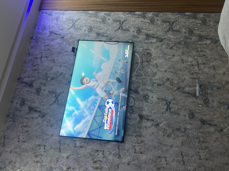 A flat-screen TV is mounted on a wall with a textured, gray-toned pattern. The screen displays an anime show, "Captain Tsubasa," featuring characters playing soccer. Light blue skies and a stadium backdrop are visible. A power outlet is located on the wall to the right of the TV. A thin, brown-toned slat ceiling is visible above the wall.