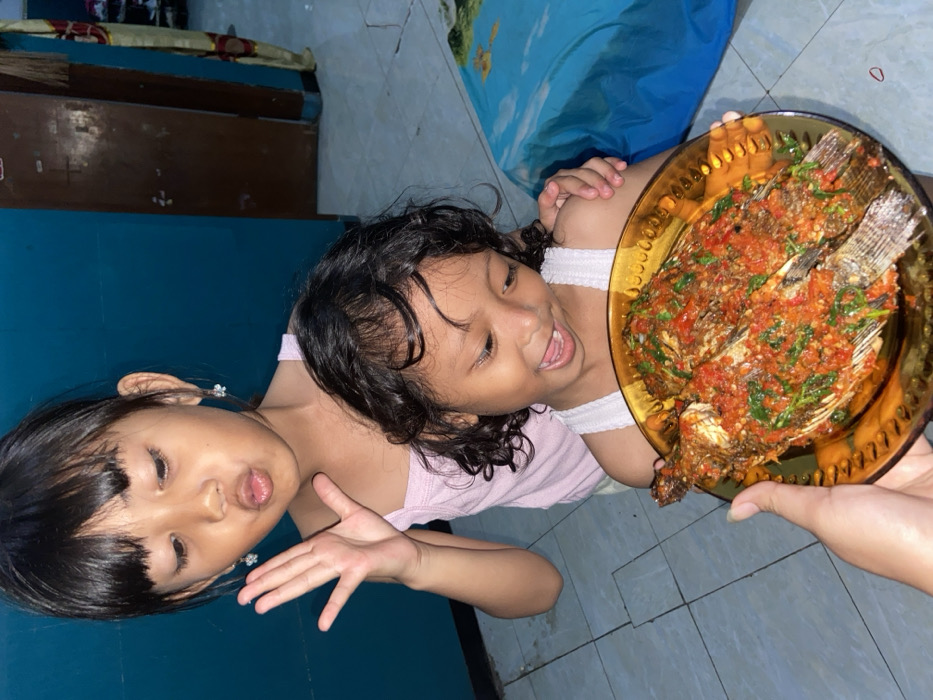 The image displays an indoor scene, consistent with a domestic setting in Gelam, Indonesia, though specific coordinates are not discernible. Two young Asian children, approximately 3-7 years old, are positioned in the center, looking down at a meal. An unseen individual's hand, partially visible in the lower-left, holds a round, amber-colored glass plate. The plate contains two whole, pan-fried fish, generously covered with a vibrant red chili paste (sambal) and visible green herbs. The older child, standing slightly behind and to the left, has straight, dark hair with bangs, wears a light pink sleeveless top, and small flower-shaped earrings. Her lips are pursed, and her right hand is raised with fingers splayed. The younger child, in front, has dark, curly hair, wears a white sleeveless top, and exhibits a wide, open-mouthed smile or laugh, directing attention to the food. The younger child's right arm is casually draped over the older child's left shoulder. The background consists of a plain dark teal wall on the left. To the right, a lighter blue wall is visible, featuring a dark brown wooden door and frame. The floor is tiled with light-colored, square ceramic tiles. A blue object, possibly a covered bed or large cushion, is partially visible on the far right. The scene is illuminated by artificial light.