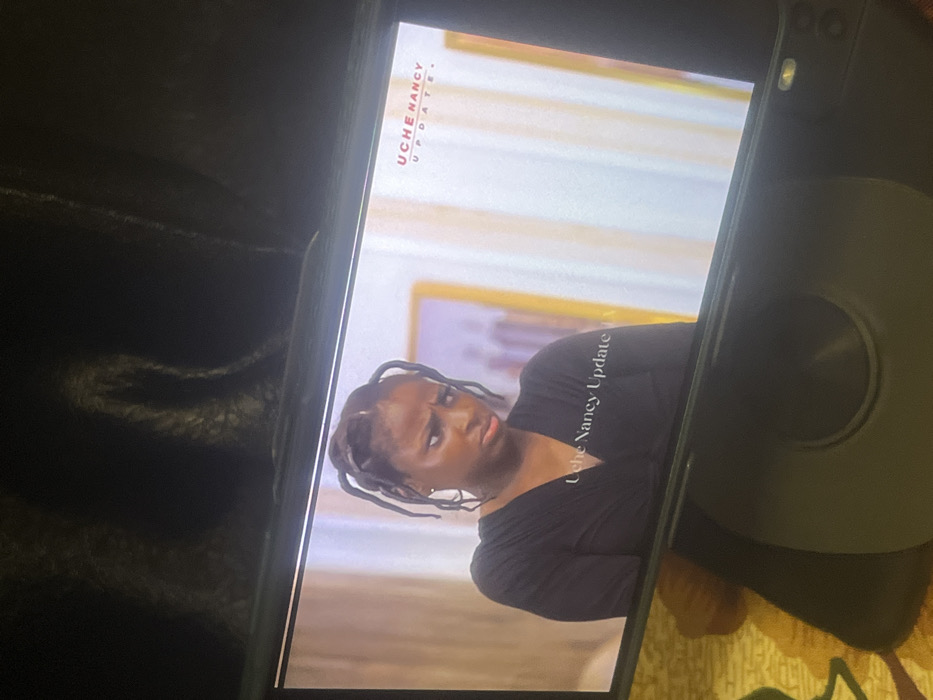 A phone displays a screen capture of a woman on what appears to be a show or video. The text "Uche Nancy Update" is visible on the top left and overlaid on her chest. She has dark skin and her hair is styled in braids. She is wearing a black shirt and looks annoyed. The phone has a dark case with a pop socket attached to the back. The background is blurry.