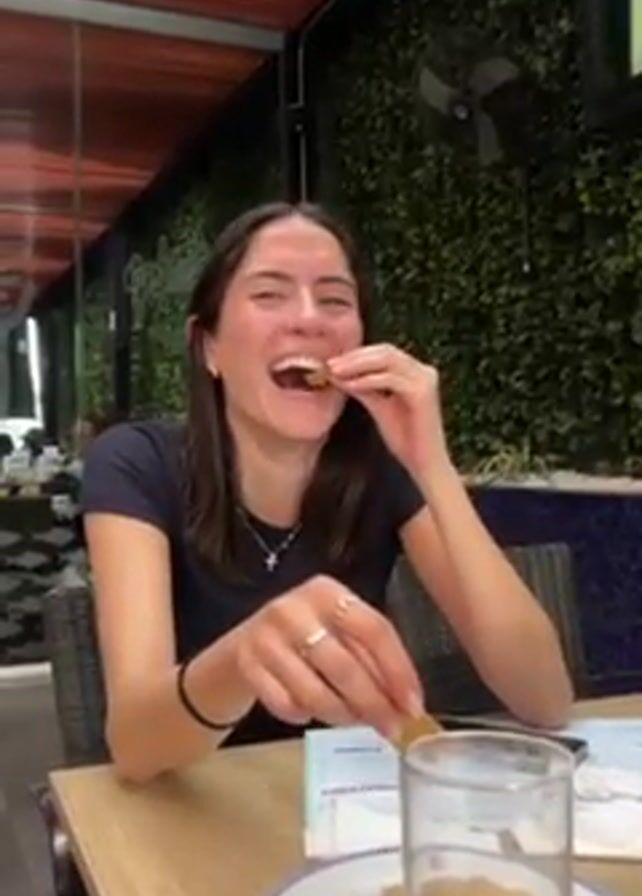 A young woman is seated at an outdoor restaurant table, eating a piece of food and laughing. She is wearing a dark t-shirt and several rings. On the table, there is a glass of water, a plate with food, and a menu. In the background, there is a green wall of plants and a television screen showing a soccer game. The camera is positioned at the table level, focusing on the woman's face.