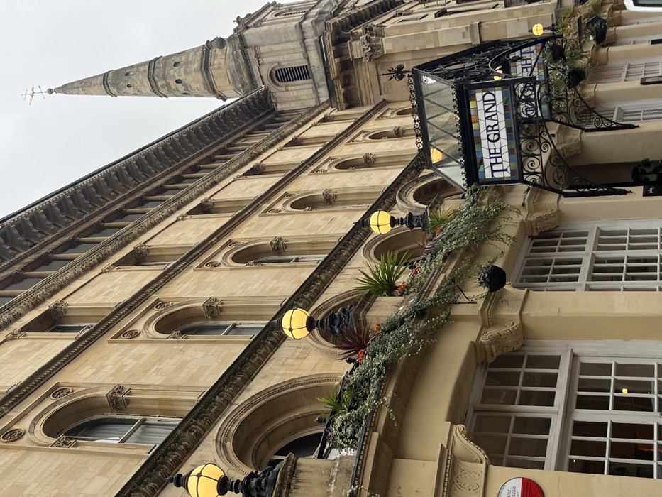 The image displays the exterior of The Bristol Hotel, formerly known as The Grand Hotel, situated on Broad Street in Bristol, United Kingdom. The building presents a multi-story, light-colored stone facade with classical architectural detailing, including numerous arched windows on its upper levels, decorative pilasters, and ornate cornices. A prominent balcony area on the second floor is adorned with extensive green foliage, including trailing vines and potted plants featuring some red and orange flowers. Three spherical, yellow-illuminated lanterns, mounted on dark, decorative posts, are positioned along this balcony. The ground floor exhibits large rectangular windows with white frames. The main entrance, visible towards the right of the frame, is covered by an elaborate black wrought iron canopy. Suspended beneath this canopy is a leaded-glass style sign that reads "THE GRAND" in white lettering against a mosaic background. Additional hanging baskets containing greenery are visible near the ground floor. In the upper right portion of the image, behind The Bristol Hotel, the stone spire of Christ Church with St Ewen is visible, featuring small arched openings and topped with a weather vane. The sky is uniformly overcast. No individuals or specific activities are depicted within the scene.