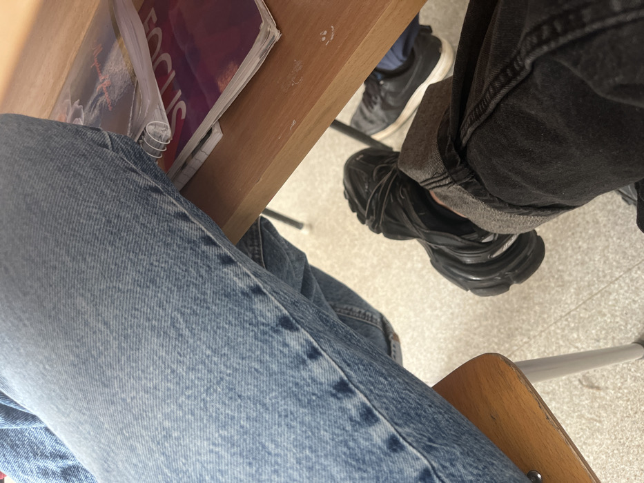 The image displays an indoor scene, likely a classroom or lecture hall, viewed from a seated perspective. The upper left portion shows a person's thigh clad in light blue denim jeans. To the right, a light-colored wooden desk surface is visible, hosting a stack of spiral-bound notebooks and books, including one with "FOCUS" visible on its cover. A small, etched smiley face is present on the desk surface near the right edge. Below the desk, the lower legs of a second individual are visible, wearing dark, possibly black or dark grey, cuffed jeans and black chunky-soled athletic shoes. A second pair of dark sneakers with white soles is partially visible on the light-colored tiled floor beneath the desk. White and dark metal furniture legs are discernible in the background. The image provides no specific visual cues to identify a precise location within the city of Veliko Tarnovo, Bulgaria.