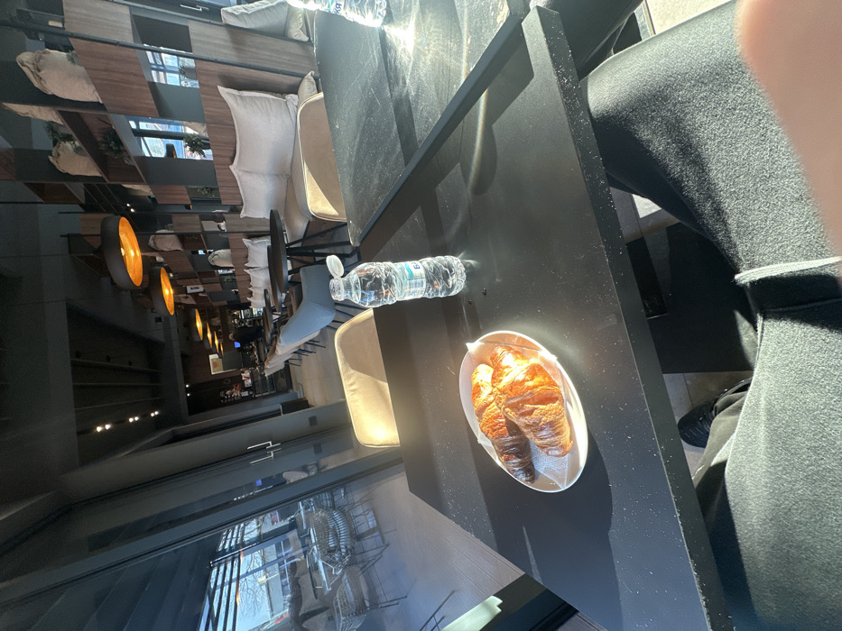 This image depicts the interior of a modern café or restaurant located in Sopot, Bulgaria. The primary viewpoint is from a seated position, with the observer's legs, clad in dark athletic pants and a dark shoe, visible beneath a black rectangular table in the foreground. On the table, a white oval plate holds two croissants—one golden-brown and one darker brown—both appearing to be lightly dusted. Adjacent to the plate, an open plastic bottle of water stands. Strong natural sunlight streams in from a large window on the left, casting distinct shadows across the tabletop. The midground reveals a clean, contemporary seating area featuring multiple light-colored chairs and small, round dark tables, alongside a continuous booth seating arrangement with light beige cushions against a dark, wood-paneled wall. In the background, a service counter is visible, with at least one individual present. Above this area, an array of stylish pendant lights with warm, orange-toned interiors hang from the dark ceiling, providing ambient lighting. A shelving unit on the right wall displays decorative objects that resemble large sacks. Through the expansive glass panels on the left, an outdoor patio seating area with metal-framed chairs and a blurred street or exterior environment are visible. The overall scene suggests a quiet morning or afternoon meal.