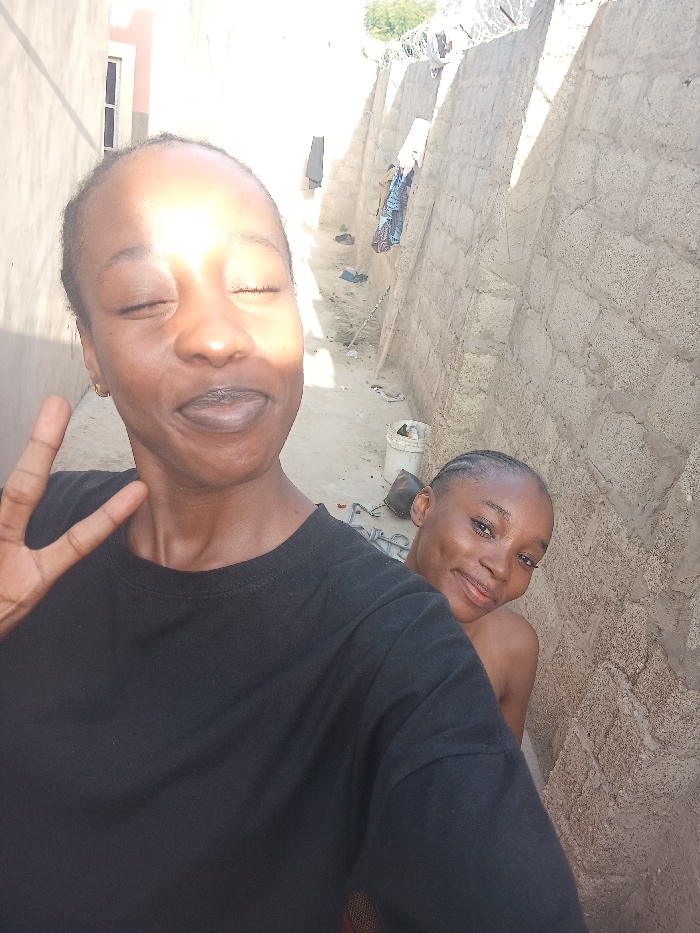 Two females are depicted in an outdoor alleyway or narrow path within the city of Dabawa, Nigeria. The foreground individual, with dark skin and wearing a black t-shirt, has her eyes closed and mouth slightly open, displaying a "peace" sign with her left hand. Her face is brightly lit by direct sunlight. Behind her right shoulder, a second female with dark skin is partially visible, smiling towards the camera and exhibiting dimples. The immediate background features a light-colored wall on the left and a rough concrete block wall on the right. Clothes are hung on the right wall, which also has barbed wire visible along its top. The ground is unpaved dirt, where a white plastic bucket, a dark bag, and other debris are present.