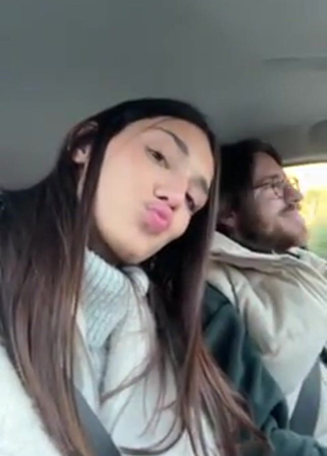 A woman with long brown hair and light skin is in a car, making a kissing face at the camera. She is wearing a light-colored, fuzzy jacket over a gray sweater. A man with brown hair and glasses is sitting in the passenger seat. He's wearing a light vest over a green sweater. The car is moving. The woman looks away from the camera and then smiles.