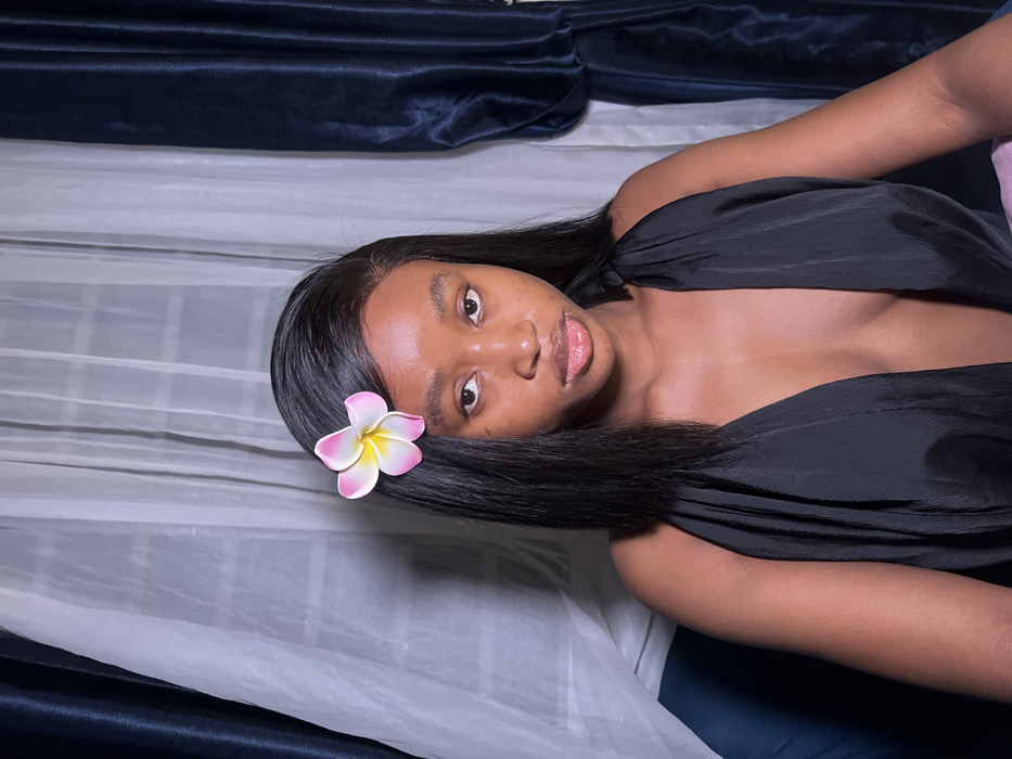 A young woman with dark hair lies on what appears to be a bed with a white sheet and a dark blue fabric backdrop. She wears a black, off-the-shoulder top. A pink and white plumeria flower is pinned to her hair near her temple. She looks directly at the camera with a slight smile. The photograph is taken at an angle, with the woman tilted to the side.