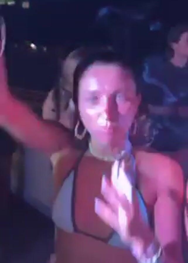 nightclub scene with multiple people dancing and socializing under dynamic lighting. The crowd appears lively, with some individuals wearing casual attire like tank tops and swimsuits. A DJ is visible in the background, seemingly controlling the music and atmosphere. Overall, the video portrays a vibrant and energetic nightlife setting.