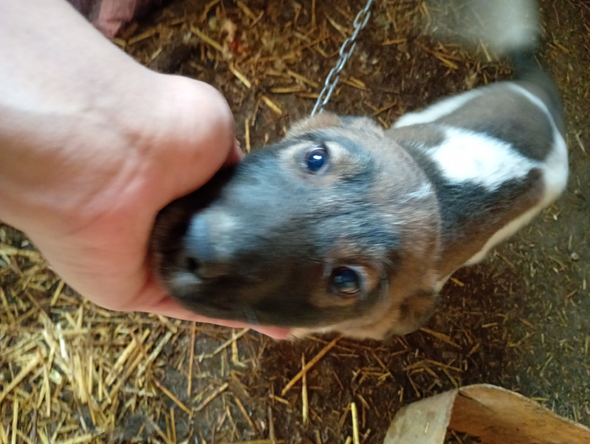 - "A human hand is grasping the head of a small brown and white puppy on a bed of straw" by FM-xXQqK2, licensed under CC BY 4.0