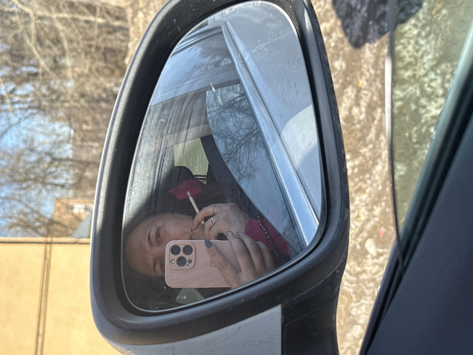 - "The image displays a close-up perspective of a car's passenger-side mirror, capturing a reflection of an adult female inside the vehicle" by FM-VJm8n1, licensed under CC BY 4.0