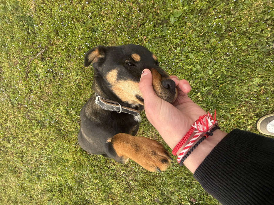 - "A high-angle, close-up outdoor scene in Lehchevo, Bulgaria, depicts a human left hand interacting with a dog lying on green grass" by FM-TPcbk2, licensed under CC BY 4.0