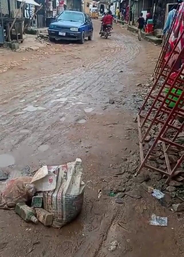 muddy, uneven street in what appears to be a residential area. A blue car is parked on the street. A motorcycle with two people on it drives past the car. Several people are walking in the distance. On the right side of the video is a red metal scaffolding. In the foreground there's a large sack, some bricks and bottles. The street is lined with small shops or stalls, and a multi-story building is visible in the background.
