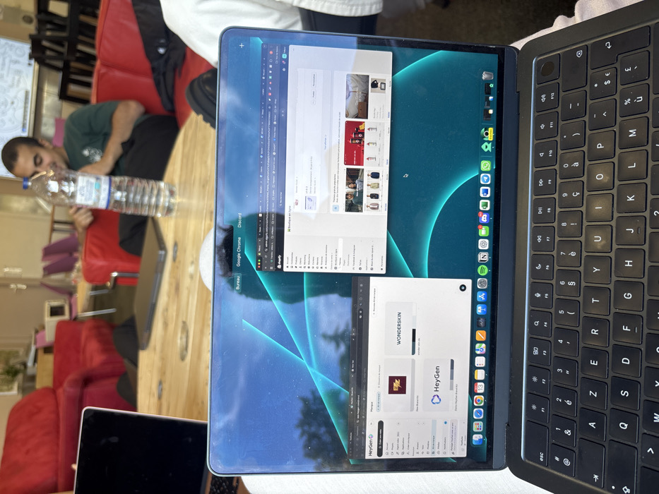 The image depicts an indoor communal workspace or lounge, consistent with a location in Strasbourg, France. In the immediate foreground, a dark-colored laptop with an AZERTY keyboard is open and in active use. Its screen displays a dark blue and green abstract desktop wallpaper. Overlaying the wallpaper are two primary application windows: one is a Google Chrome browser tab showing the Shopify admin interface for an online store ("Boutique en ligne"), featuring product images of apparel and small bottles. The second window displays an interface labeled "HeyGen - Brand Kit," featuring "WONDERSKIN" and "EZ" logos. The macOS dock, populated with numerous application icons including Chrome, Discord, Slack, Spotify, and WhatsApp, is visible at the bottom of the screen. A portion of light-colored fabric, likely clothing of the laptop operator, is visible to the lower left. In the midground, a large, round, light-colored wooden table is central. On this table, a closed dark-colored laptop or tablet is positioned. A young adult male, with short dark hair, wearing a dark green short-sleeved t-shirt and dark trousers, is seated on a bright red sofa behind the table. He is holding a large, clear plastic water bottle with both hands and looks towards the right side of the frame with a subtle smile. Several other bright red sofas and armchairs are arranged around the wooden table. In the background, purple chairs, another table, light-colored walls, and an indistinct whiteboard are visible. The overall environment appears brightly lit, suggesting a combination of natural and artificial lighting.