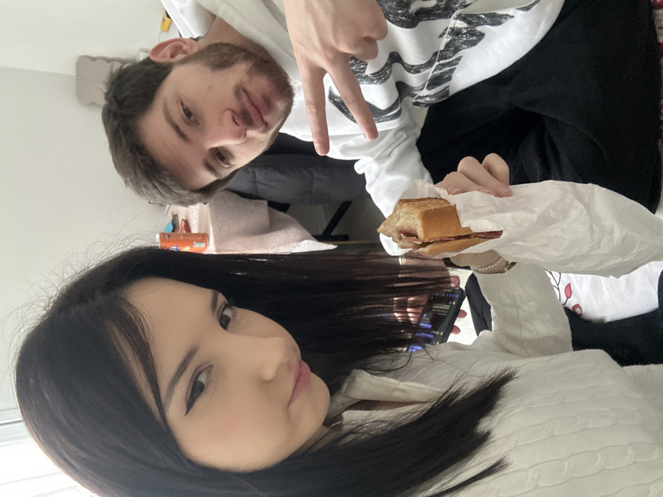 The image captures two individuals within a private indoor space, likely a residence, in Cachan, France. On the left, a female with long dark hair, wearing a white long-sleeved top, looks directly at the camera with a neutral expression. She holds a smartphone in her left hand and a partially unwrapped baguette sandwich, containing a dark pink filling consistent with cured meat, in her right hand. On the right, a male with short brown hair and a beard, wearing a white hooded sweatshirt with a dark graphic design, also looks towards the camera. He extends his right hand, forming a V-sign. In the background, a light-colored wall is visible. To the right of the female, a table covered by a light-colored tablecloth holds an orange beverage can. A dark jacket or piece of clothing is draped over an unseen object behind the male. A floral patterned fabric is partially visible in the lower left corner, indicating the surface on which the individuals are seated.