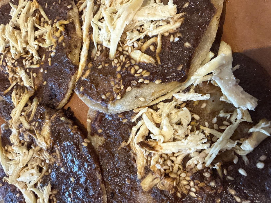 close-up of several Tlayudas, a Mexican dish. The round tortillas are topped with a dark, rich mole sauce. Shredded white meat, likely chicken or turkey, is scattered across the surface. Sesame seeds add texture and flavor to the Tlayudas. The background is a plain brown surface.