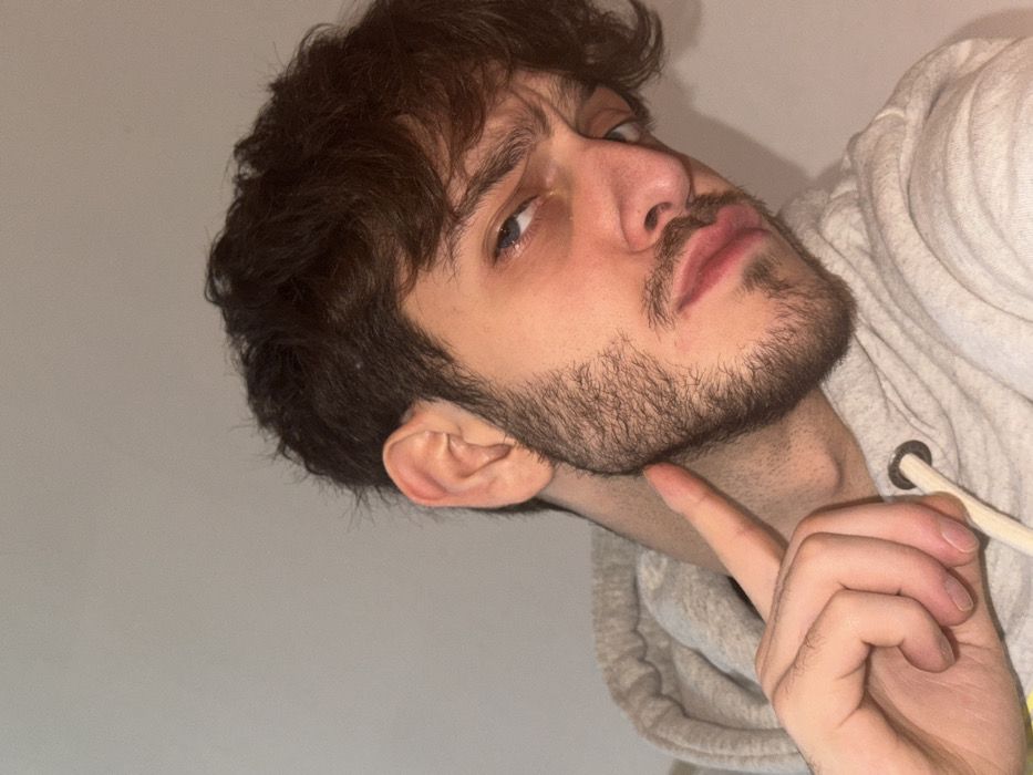 The image displays a close-up, slightly angled portrait of a young adult male in an indoor setting