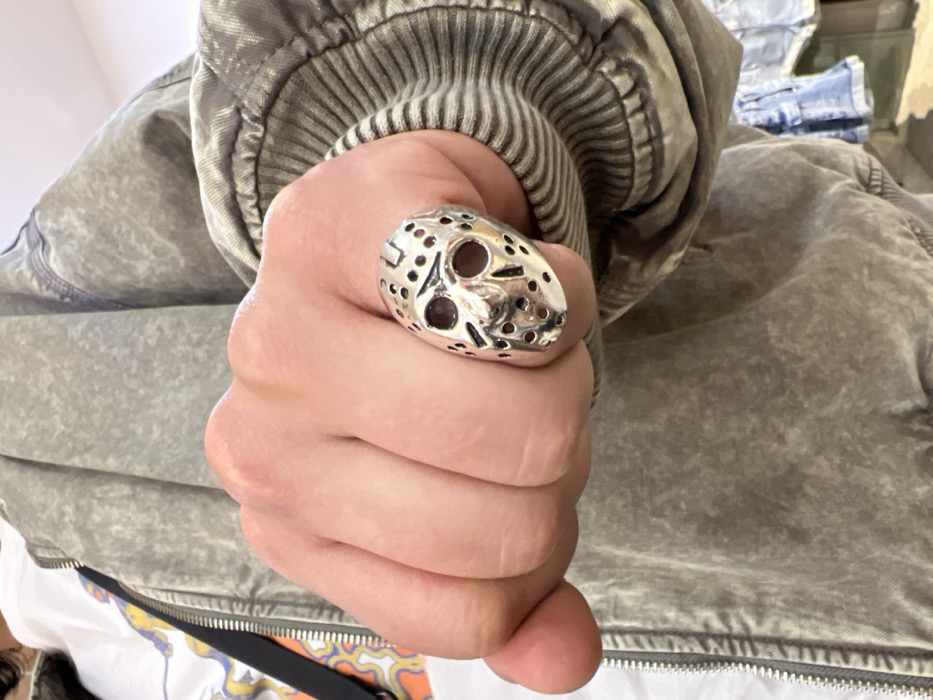 A close-up image features a human hand, likely the right, positioned in a slightly clenched fist. A silver-toned ring, sculpted in the likeness of a hockey mask with characteristic perforations and darkened eye holes, is worn on the ring finger. The individual is dressed in a faded, distressed olive-grey zippered jacket, worn over a white t-shirt displaying a visible colorful graphic design. A black strap is visible over the t-shirt. The background is out of focus, showing hanging blue denim garments, indicating an indoor retail clothing store environment. The specific location within Bogota, Colombia, cannot be determined from the visual evidence presented.