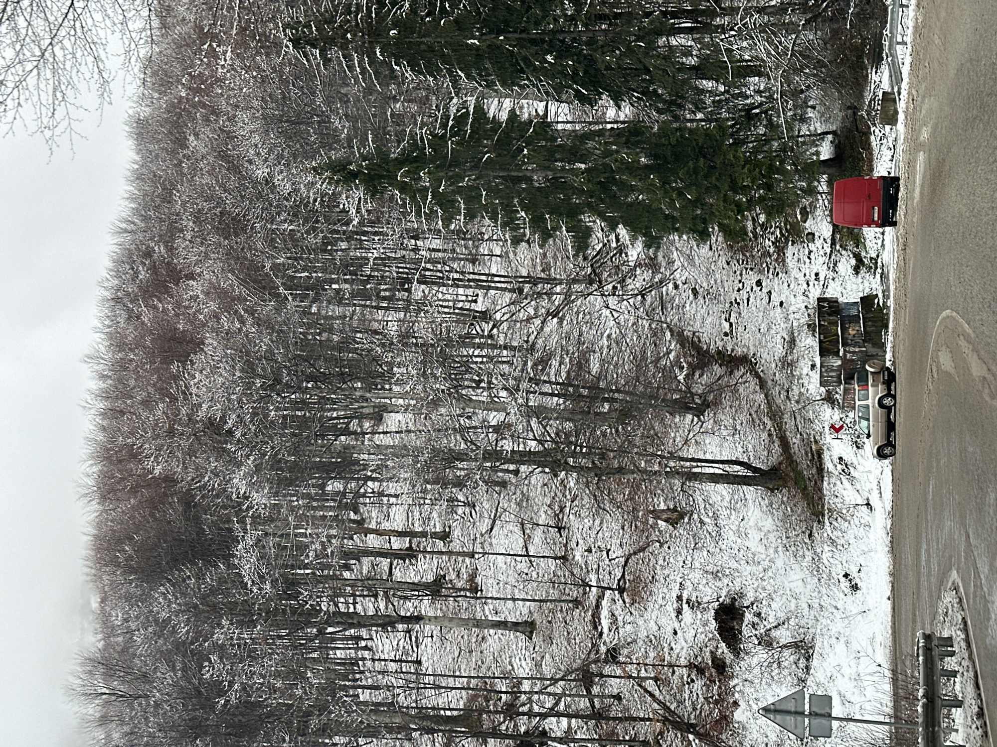 The scene depicts a snow-covered mountain road and forest under an overcast sky, located in the vicinity of Barziya, Bulgaria. A wet, asphalt road curves sharply to the left in the foreground, with snow and slush accumulating on its shoulders. A metal guardrail runs along the left edge of the road, behind which a triangular road sign indicating a sharp right curve or hazard is visible. Two vehicles are present. A light-colored SUV, possibly a Toyota RAV4 with a rear-mounted spare tire, is positioned on the right side of the road, appearing to navigate the turn, facing generally left. Its license plate is partially visible. Further down the road on the right shoulder, a red cargo van is parked or stopped, facing away from the viewer. Its Bulgarian license plate is legible. Behind the SUV, a concrete block structure with dark, possibly graffiti-covered surfaces is visible. The hillside beyond the road is densely forested. The majority of trees are bare deciduous trees, coated in a thin layer of snow or frost, with snow covering the ground beneath them. Several tall, dark green coniferous trees, also dusted with snow, are prominent on the right side behind the red van and within the larger forest. The upper slopes of the forest blend into a misty, grey sky. No individuals are visible.