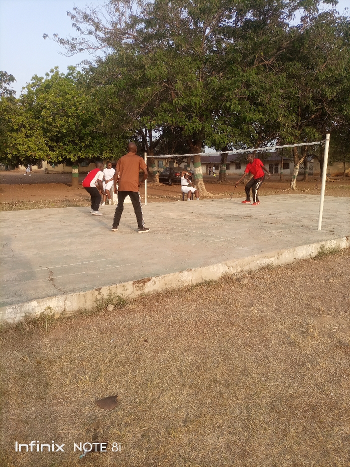 A group of people are playing badminton on an outdoor concrete court. A net divides the court, and players are positioned on both sides. The player on the right is in a red shirt, while the player on the left wears a red and white shirt. Another individual stands behind the player in the red and white shirt, wearing a brown shirt. People are seated in chairs near a tree in the background. A car is parked nearby. The ground is covered in dry grass, and the sky is pale blue.