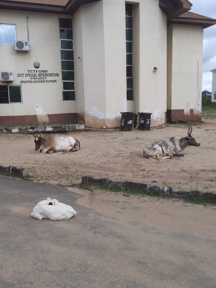 The image depicts an outdoor scene in Ihiagwa, Nigeria. A two-story, cream-colored building with a brown sloped roof occupies the background, featuring multiple windows and two wall-mounted air conditioning units. The text "TETFUND 2017 SPECIAL INTERVENTION PROJECT (DISASTER RECOVERY SUPPORT)" is stenciled on the building's left wall. Paint is visibly peeling from the lower sections of the building's exterior. Two black trash bins stand near the building's base on the right. The ground directly in front of the building is unpaved, consisting of sand or dirt. Two adult bovines are lying on this unpaved area: one light brown and white cow is situated on the left, and one grey and white mottled cow with prominent horns is positioned on the right. In the foreground, a smaller white calf is curled up and resting on a paved asphalt surface. No human presence is observed. The sky is overcast.