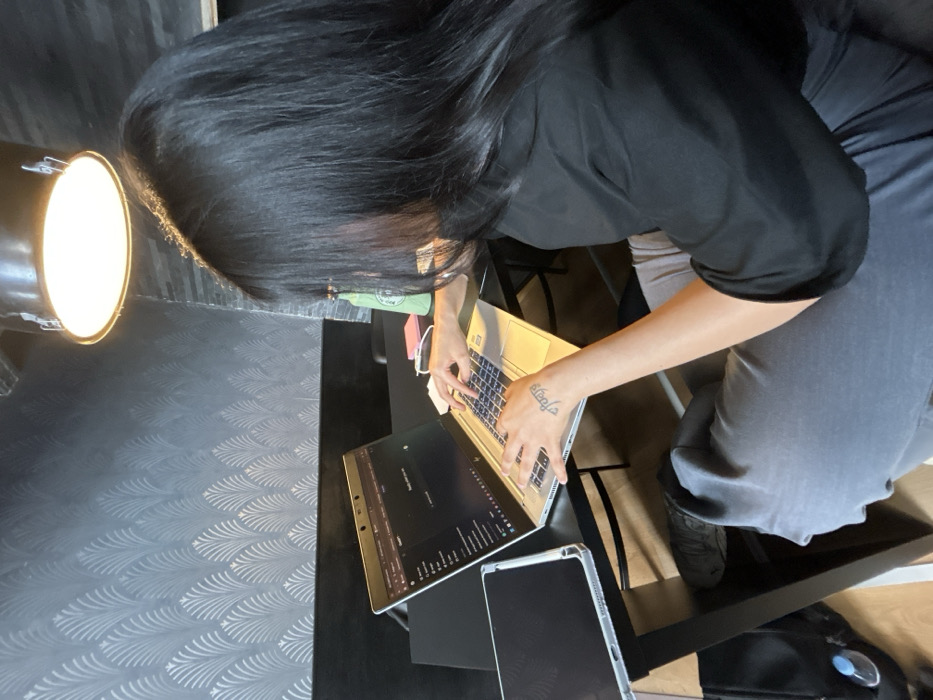 An individual is seated at a black table in an indoor setting within the city of Bochum, Germany. The person, viewed from the right-rear, possesses long, dark hair and wears a black short-sleeved shirt and grey pants. Both hands are positioned over the keyboard of an open silver laptop, actively typing. A tattoo is visible on the inner right wrist. The laptop screen displays a dark interface with various icons and text, indicating an active application. To the left of the laptop, a tablet in a clear protective case rests on the table with a dark screen. To the right, a light green bottle and a small pink object are present. The wall behind features light-colored, fan-shaped patterned wallpaper above a dark horizontal border. An industrial-style ceiling light with a circular diffuser provides overhead illumination. A black bag and the individual's shoe are partially visible beneath the table.