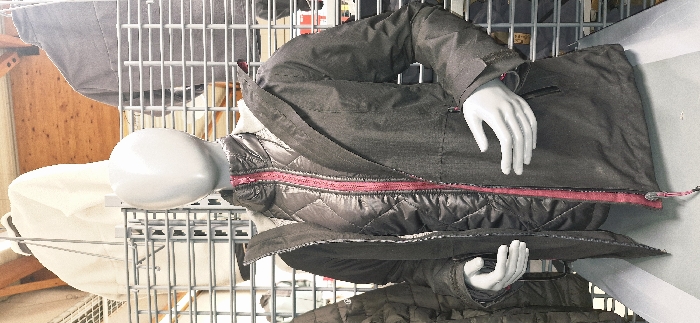 This image captures a headless, light grey mannequin displaying layered outdoor apparel within a retail store in Vendin-le-Vieil, France